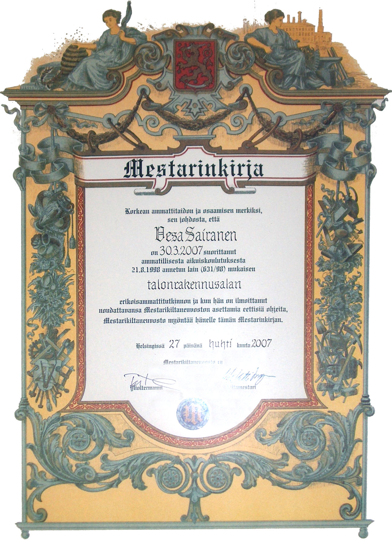 Mestari Vesa Sairanen on suorittanut talonrakennusalan erikoisammattitutkinnon, aiheena vaativat hirsityöt, vaativat puukorjaukset ja yrittäjyys, ja on toiminut alalla yli 20 vuotta.